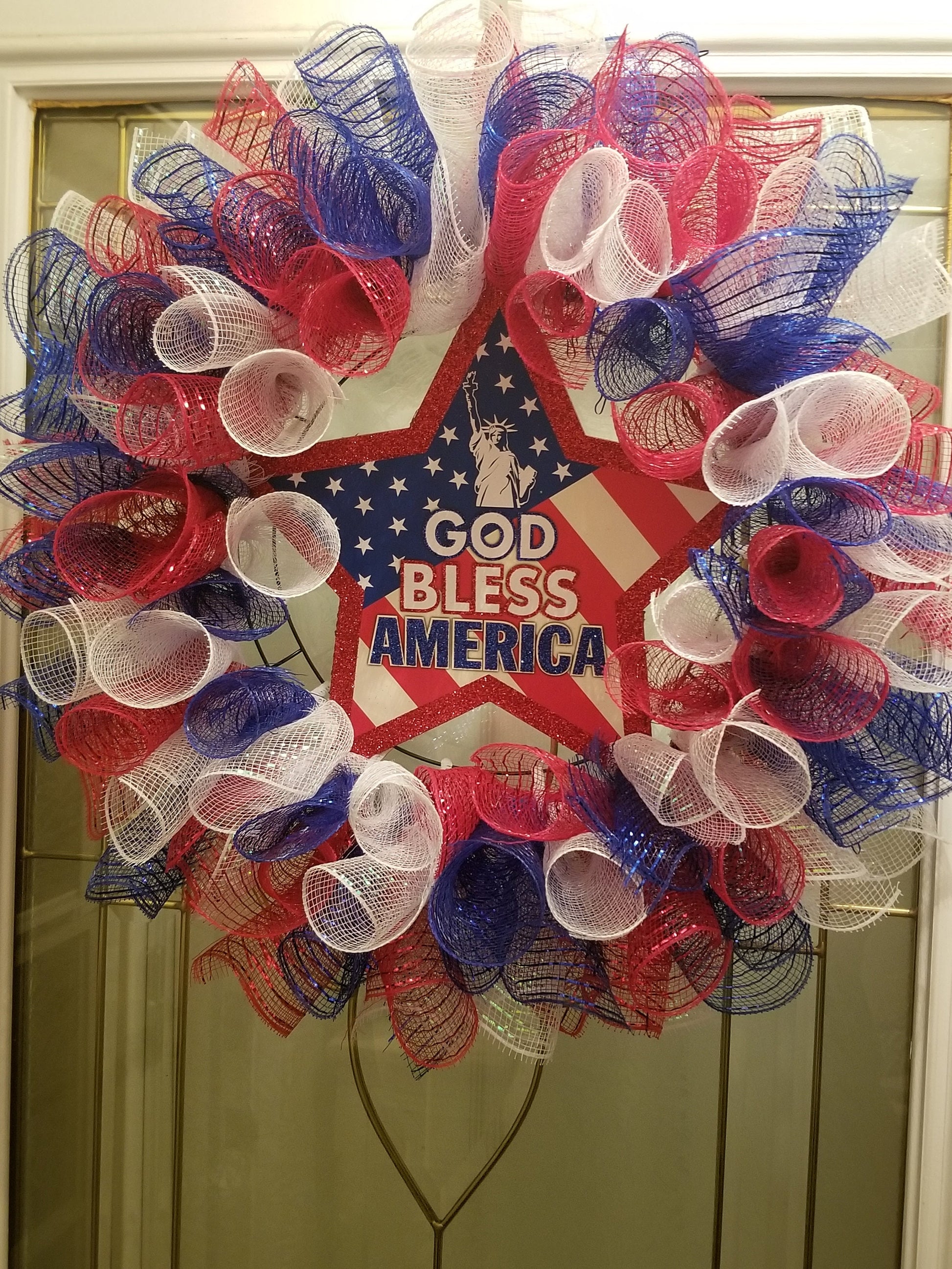 Fun and patriotic. Mesh wreath with wooden painted sign.