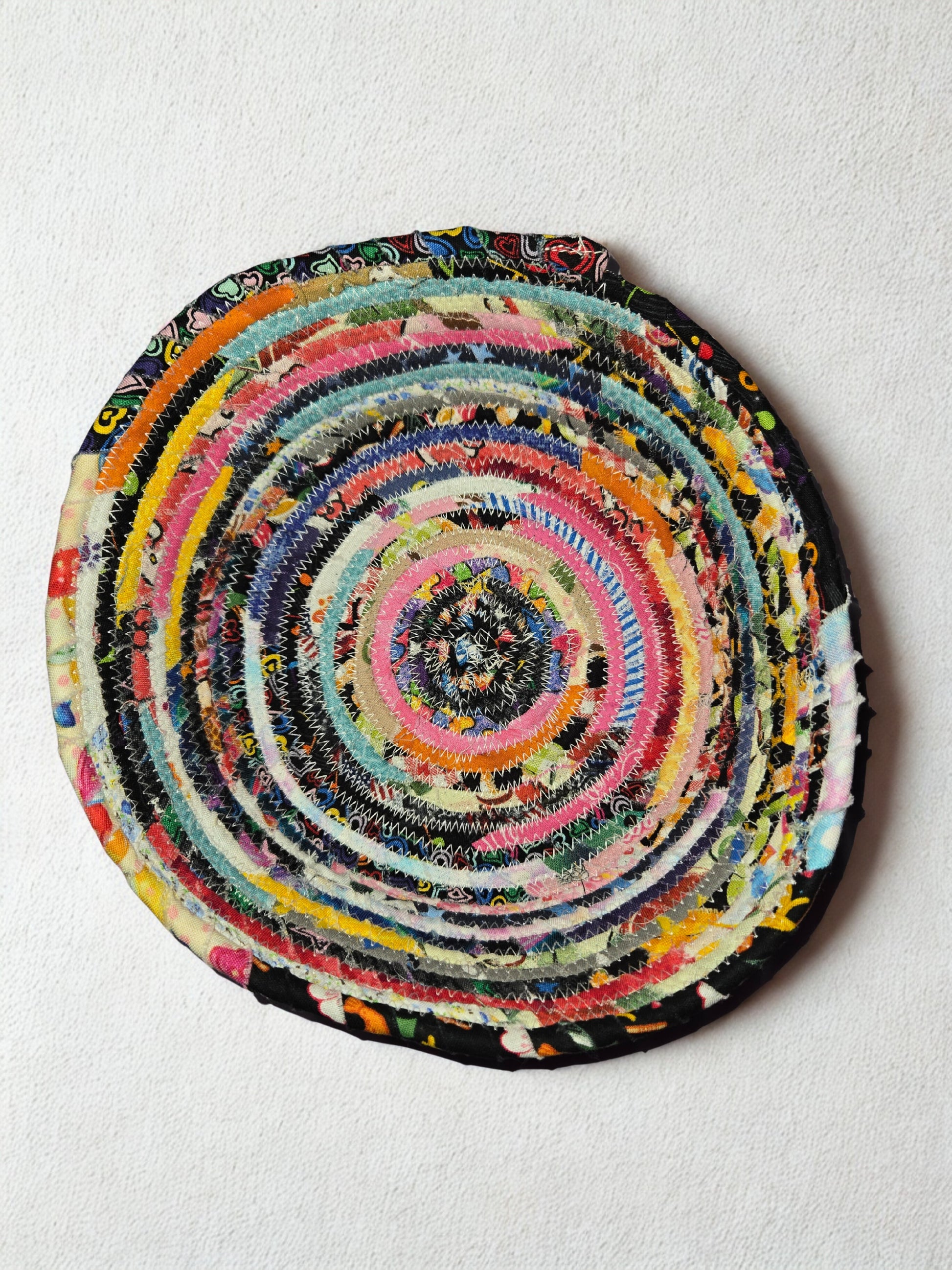 Upcycled fabric scraps turned into a bowl. Base is about 6". Very sturdy to hold keys or pens. great on a table with decor in it. Product may vary from actual picture depending on fabric scraps available at time product is made. If specific color is picked then bowl will mostly be shades of specific color. Product pictured is multicolor.