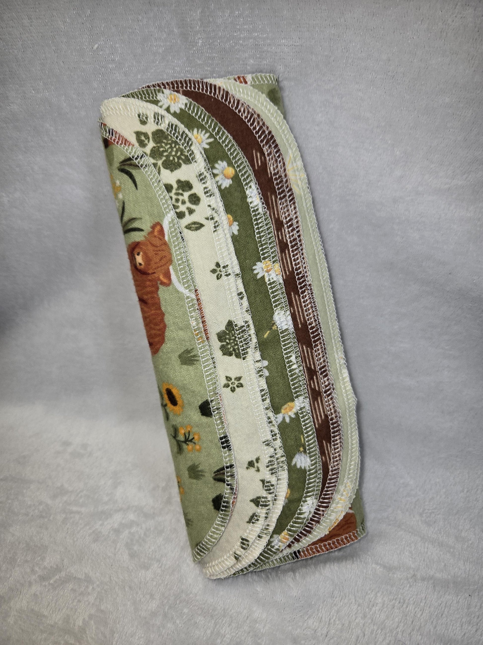 100% Cotton flannel. 10 pack of reusable paper towels. 2 of each pattern. All fabric is preshrunk.